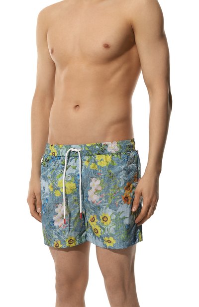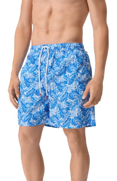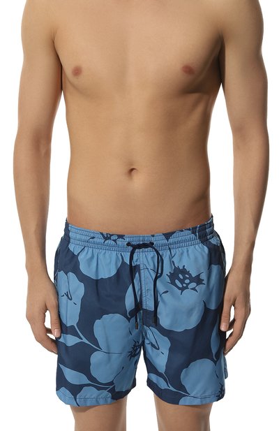 Плавки-шорты с растительным мотивом в оттенках синего выполнили из мягкого полиэстера, устойчивого к воздействию соленой и хлорированной воды. Модель с металлическими люверсами и эластичным поясом-кулиской быстро сохнет и не выгорает на солнце. Принадлежность марке обозначили вышитым логотипом на клапане накладного кармана сзади.