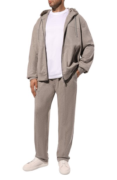 Для изготовления брюк с высокой посадкой использовали стрейчевый хлопковый твил с добавлением шелка. Модель с четырьмя карманами декорировали фирменным патчем на эластичном поясе сзади и вышитым логотипом на шлевке спереди.