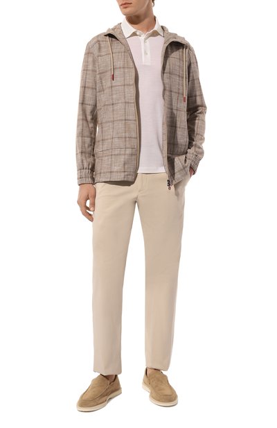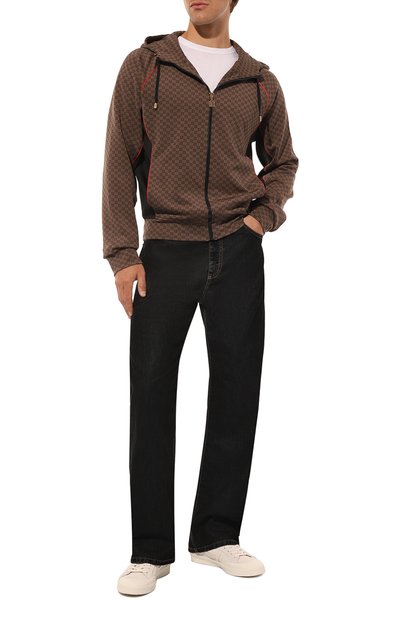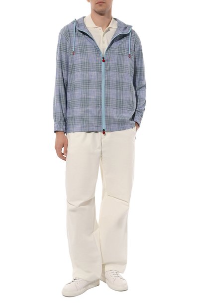 Бежевой толстовке придали сходство с рубашкой, выбрав для пошива не футер, а плотный клетчатый материал на основе шерсти, шелка и хлопка. Такой текстиль защищает от легкого ветра и поддерживает оптимальный микроклимат, поэтому модель станет хорошим дополнением к межсезонному гардеробу. Изделие с крупными карманами и регулируемым капюшоном застегивается встречной молнией с фирменными красными пуллерами.
