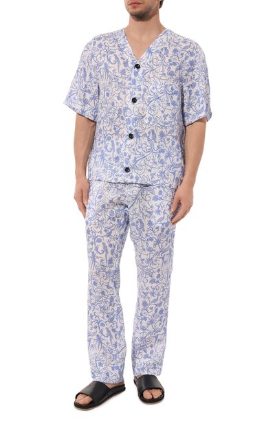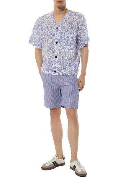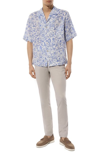 Голубая прямая рубашка с короткими рукавами сшита из тонкого дышащего льна с затейливым принтом в виде тропических растений и птиц. Сложный процесс создания каждого изделия включает 22 операции, которые выполняются вручную. В результате получается легкая модель, которая безупречно садится по фигуре и не ограничивает движения.