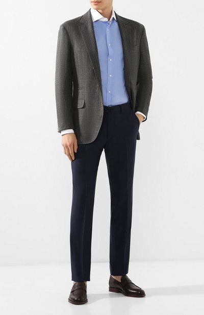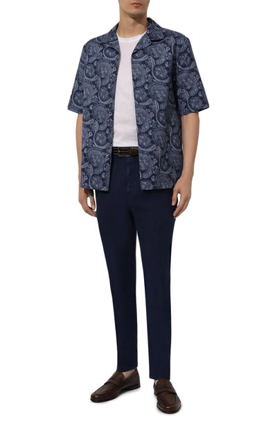 Для создания синих брюк с защипами над стрелками неаполитанские портные использовали тонкую легкую ткань из прочного ирландского льна. Текстиль с неоднородной фактурой отлично пропускает воздух и сохраняет оптимальный микроклимат даже в жаркий день. Широкий эластичный пояс дополнили потайной кулиской, гарантирующей идеальную посадку на талии.