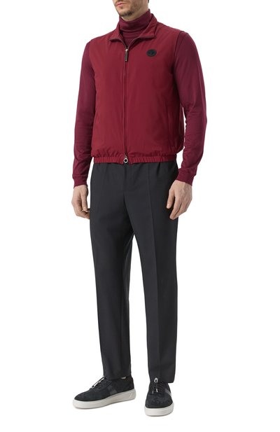 Жилет кирпичного оттенка поможет расширить палитру повседневного гардероба. Для его пошива использовали плотный полиэстер, который не боится мелкого дождя и защищает от ветра. Чтобы внутрь не проходил холодный воздух, пояс сделали эластичным, а ворот — стойкой. Именно на нем расположили логотип марки, а спереди на вещи — круглую нашивку с профилем королевского орла. Модель с боковыми карманами застегивается встречной молнией.