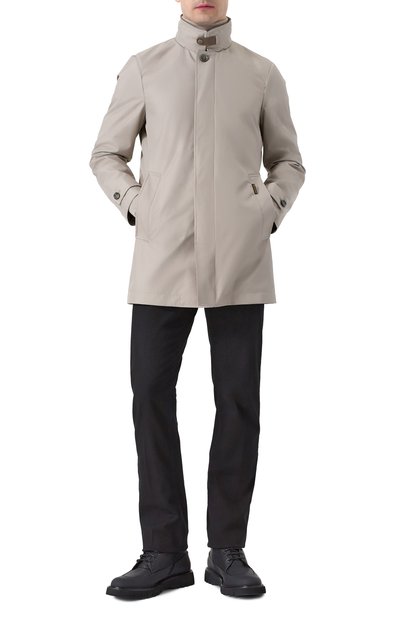 Для изготовления плаща использовали микс хлопка и полиэстера. Модель на потайных пуговицах дополнили шлицей сзади и боковыми карманами с двумя входами.