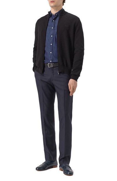 Широкая подошва из светлой резины, позаимствованная у яхтенной обуви, снижает строгость пенни-лоферов и делает их особенно гибкими. Модель с миндалевидным мысом сшили из гладкой мягкой кожи и вручную окрасили в знаковой для марки, основанной супругами Сантони, технике velatura. На готовую пару нанесли несколько слоев краски оттенков синего, чтобы сформировать деликатный градиент, похожий на естественную патину.
