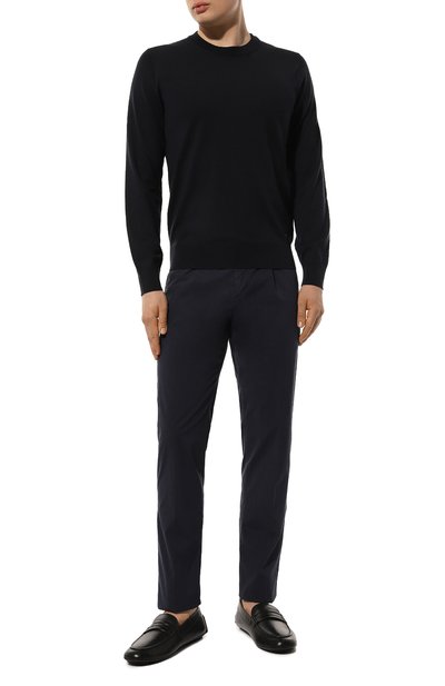 Для пошива темно-синих брюк слегка зауженного кроя мастера итальянской марки использовали приятный на ощупь текстиль на основе мягкого хлопка и гладкого лиоцелла. Материал с таким составом хорошо пропускает воздух, а стрейчевые нити делают полотно эластичным, поэтому в изделии будет особенно комфортно.