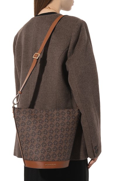 Для пошива сумки Townsend кремового оттенка использовали плотный материал с повторяющейся монограммой, составленной из инициалов Майкла Корса. Силуэт аксессуара, напоминающий трапецию, подчеркнули коричневым кантом. В тон ему — короткая отстегивающаяся ручка и съемный плечевой ремень. В модель с внутренним карманом поместятся смартфон, кошелек и футляр с очками.