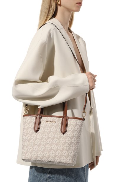 Для пошива сумки Townsend кремового оттенка использовали плотный материал с повторяющейся монограммой, составленной из инициалов Майкла Корса. Силуэт аксессуара, напоминающий трапецию, подчеркнули коричневым кантом. В тон ему — короткая отстегивающаяся ручка и съемный плечевой ремень. В модель с внутренним карманом поместятся смар тфон, кошелек и футляр с очками.