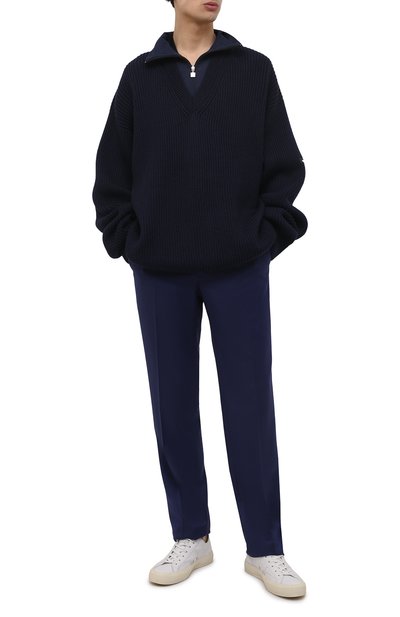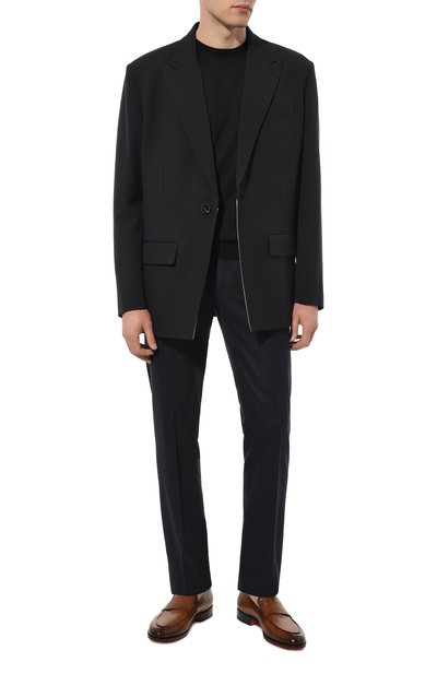 Темно-синие брюки с двумя парами карманов мастера марки, основанной семьей Зенья, сшили из гладкой шерстяной ткани, произведенной из отборного сырья, очищенного от жестких волокон: материал с плотно переплетенными шелковистыми нитями почти не мнется и хорошо держит стрелки. Модель чуть зауженного кроя одинаково гармонично впишется и в повседневный, и в офисный комплект.
