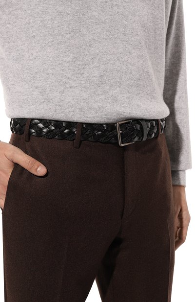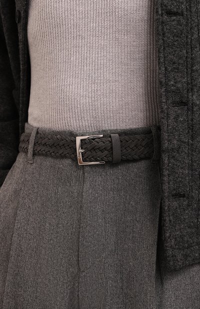 Темно-коричневый ремень сплели из узких полос мягкой и эластичной телячьей кожи. За счет ее деликатного блеска фактурный узор кажется особенно выразительным и объемным. Чтобы точно отрегулировать такой аксессуар по талии, не нужно делать отверстия. Изделие дополнено лаконичной металлической пряжкой с матовым PVD-покрытием в тон, которое защищает от коррозии и царапин.