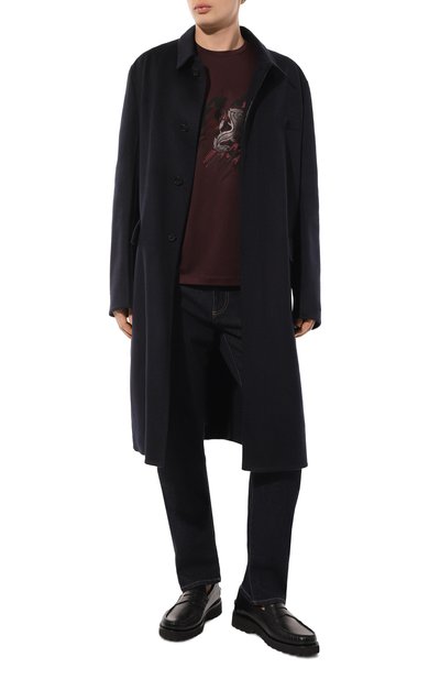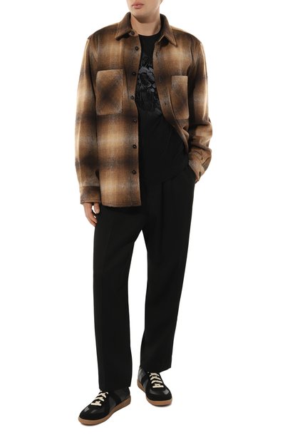 Для пошива коричневой свободной футболки со спущенной линией плеч использовали мягкое хлопковое джерси. Гладкие прочные нити создали при плетении ровную фактуру, которая не пилингуется даже после многократных стирок. Изображение орла спереди дополнили белым логотипом, выполненным курсивом.
