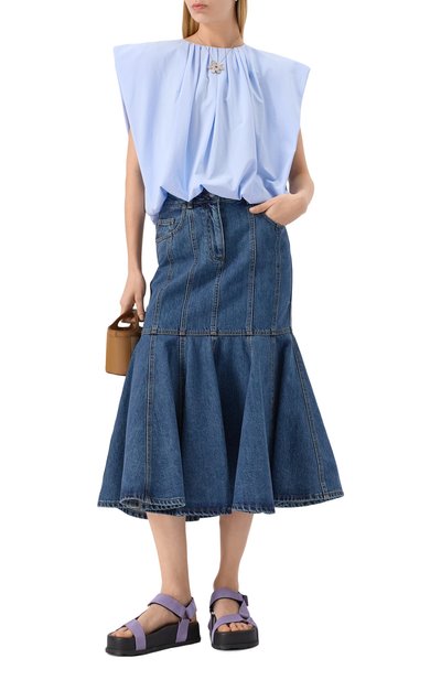Желтый топ-бюстье с короткими рукавами и резинками по краям настолько мягкий и легкий, что почти не ощущается на теле. Доменико Дольче и Стефано Габбана выбрали для пошива модели тонкий хлопковый поплин, на котором распустились желтые садовые розы. Предлагаем сочетать изделие с шортами и туфлями в тон, разбавив total look однотонной бежевой сумкой.