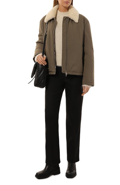 Куртку цвета хаки дополнили подчеркнуто крупными деталями. Врезные боковые карманы поднимаются почти до груди, воротник-стойка с кулиской полностью закрывает шею, отворот на капюшоне превращается в козырек, а спинку пересекает широкий клапан. Миниатюрным сделали только логотип корейской марки, вышитый слева от встречной молнии. Для изготовления модели использовали тонкий непродуваемый нейлон с жатой фактурой.