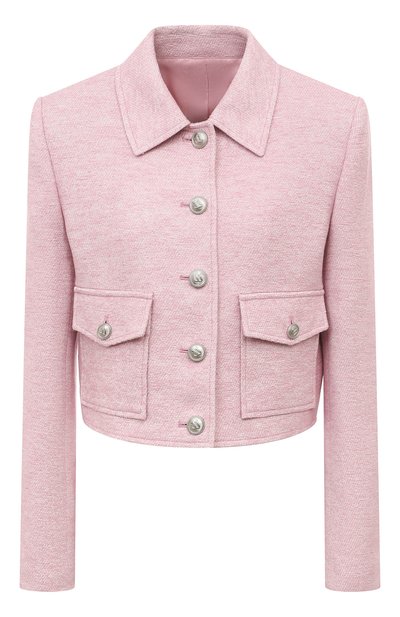 Нежно-розовый укороченный жакет с накладными карманами органично дополнит образ и с потертыми джинсами, и со строгими брюками. Для пошива модели с отложным воротником и четкой линией плеч использовали мягкий твид на основе отборного хлопка. Изделие застегивается серебристыми пуговицами с рельефной монограммой из инициалов Джуна Джи.