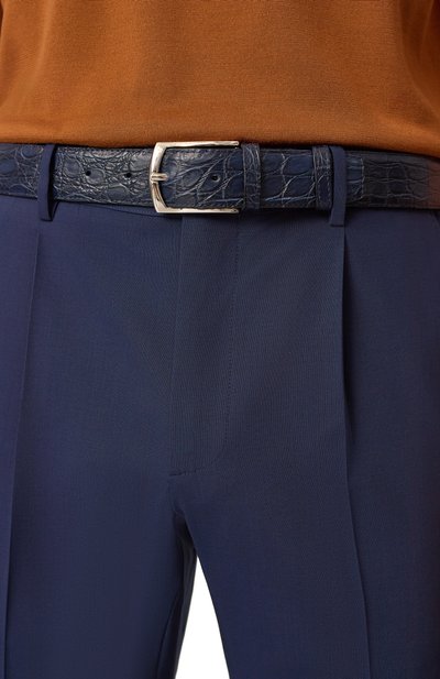 Темно-синий ремень классической ширины выполнили из особенно прочной и при этом очень мягкой кожи каймана. Уникальный естественный рисунок чешуек подчеркнули более светлым оттенком. Модель застегивается квадратной пряжкой и тренчиком в виде эмблемы, изготовленными из полированного металла с рутениевым покрытием.