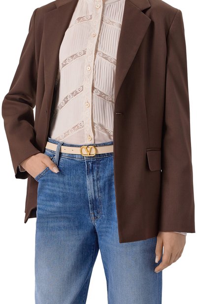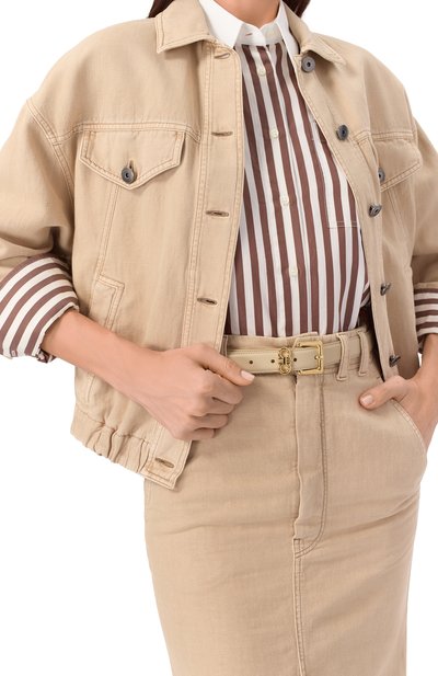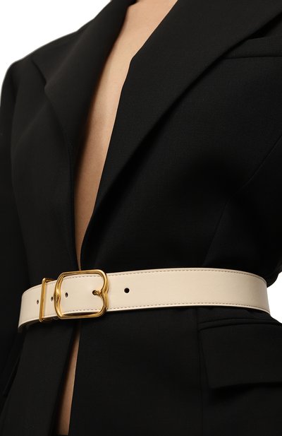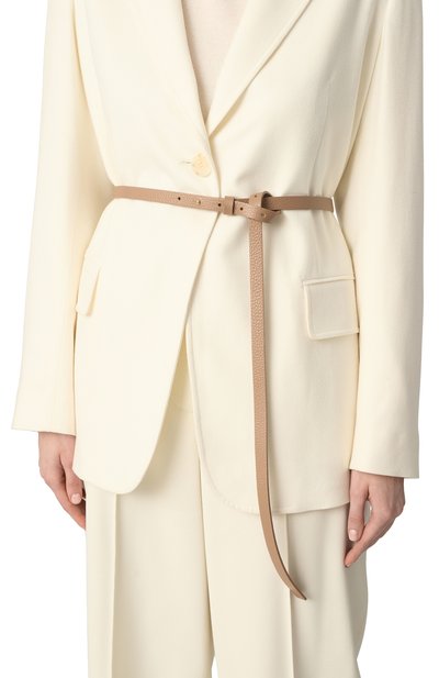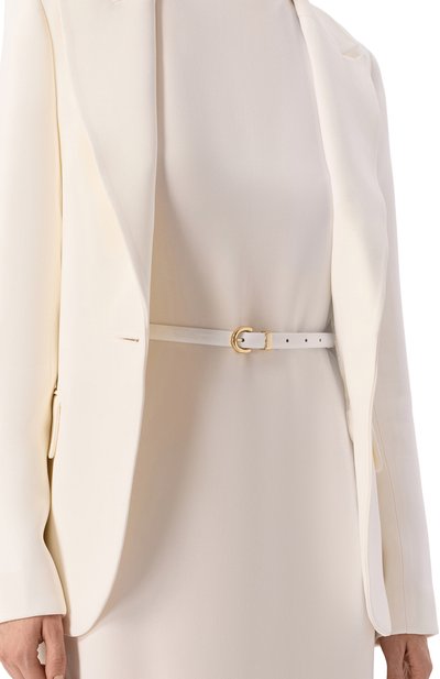 Узкий кремовый ремень выполнен из цельного отреза гладкой матовой кожи. Со временем на ней не появляются заломы, а изделия из такого пластичного материала надолго сохраняют заданную форму. Однотонный лаконичный аксессуар дополнен пряжкой с зеркальным покрытием.