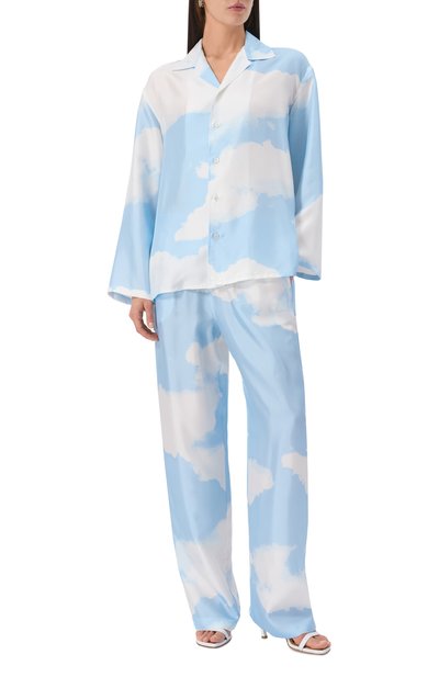 Бледно-голубые брюки с размытым абстрактным мотивом, словно нарисованным акварельными красками, получились особенно комфортными. Широкий крой модели не мешает свободно двигаться, узкий пояс с кулиской регулирует посадку на талии, а тонкий материал почти не ощущается на теле. Для пошива изделия мастера марки, основанной Эрикой Кавал лини, использовали гладкий шелковый атлас, который оставляет на коже ощущение легкой прохлады и мягко струится.