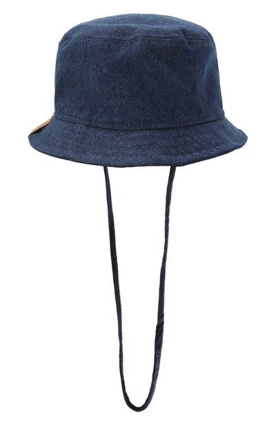 Синюю панаму с покатыми стегаными полями сшили из мягкого прочного денима. Внутреннюю отделку и широкие длинные ленты, удерживающие изделие на голове, выполнили из полосатой хлопковой ткани, которая хорошо пропускает воздух. Спереди модель украсили рельефным алым логотипом.