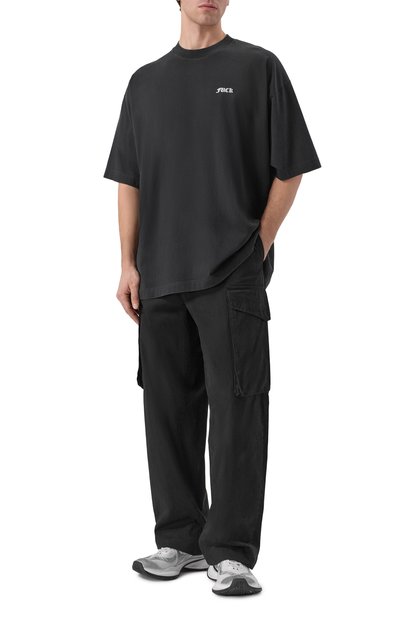 Для пошива черной укороченной футболки с миниатюрной эмблемой бренда спереди использовали мягкое хлопковое джерси. Лаконичной модели со спущенной линией плеч Джузеппе ди Морабито противопоставил длинные митенки, включенные в комплект. Их выполнили из эластичного тюля, усыпанного сияющими прозрачными стразами.