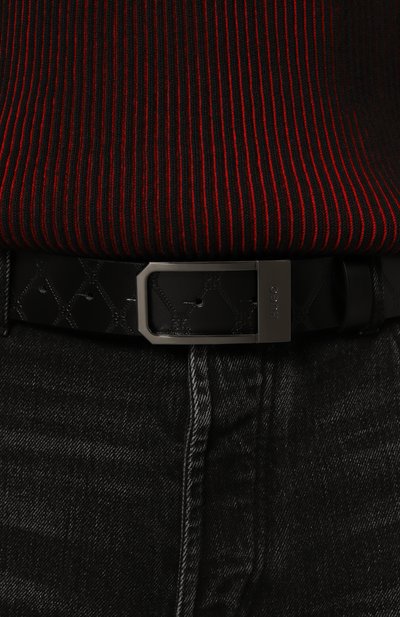 Ремень цвета хаки изготовили из плотного шелковистого полиэстера, который хорошо держит форму. Черный узкий патч с тисненым логотипом марки выполнили из матовой бычьей кожи. Прямоугольную брендированную пряжку из прочного металла украсили патиной, визуально состарив деталь.