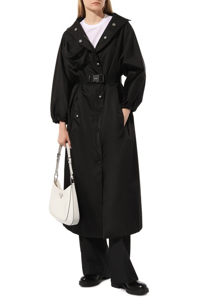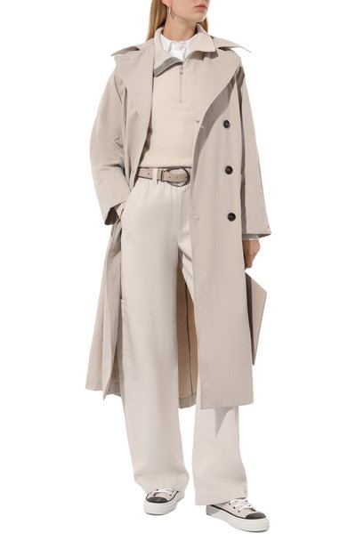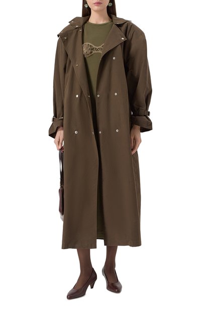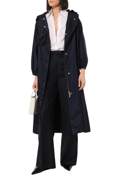 Шелковое полотно — рекордсмен в сочетании легкости и прочности, а технологичная обработка сделала его еще и водоотталкивающим. Модель дополнили сзади отлетной кокеткой, которая переходит в объемную драпировку на рукавах, и широким поясом с золотистой пряжкой. Изделие застегивается кнопками под планкой.
