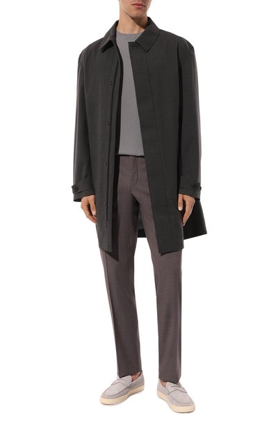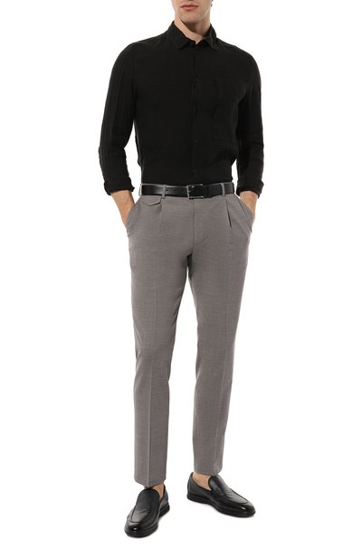 Серые лаконичные брюки поладят как с водолазкой, так и с рубашкой из офисного гардероба. Для пошива изделия со стрелками и двумя парами карманов использовали шерсть с еле заметным узором.