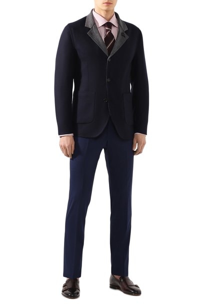Брюки универсального темно-синего цвета мастера неаполитанской марки сшили из тонкой костюмной шерсти, которая поддерживает оптимальный микроклимат и не мнется, сохраняя опрятный вид в течение всего дня. Сочетание годами выверенного кроя и ручных стежков, более эластичных, чем машинные, обеспечивает идеальную посадку модели по фигуре и свободу движений.
