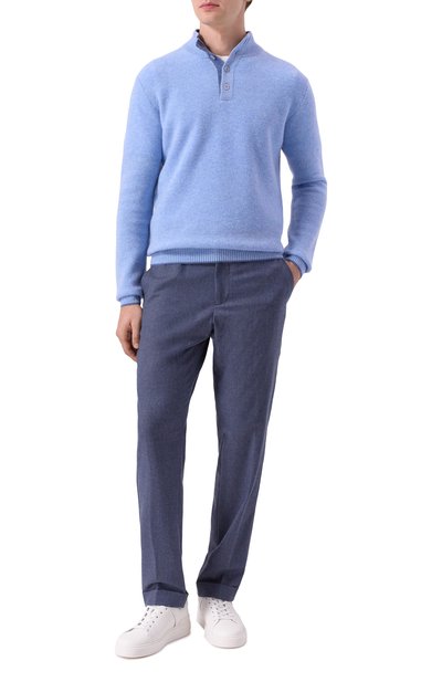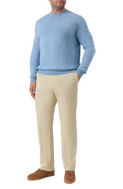 Голубой джемпер с микроузором спереди поможет освежить образ в темной палитре. Комфорт прохладным летним вечером и в межсезонье обеспечит тонкий длинноволокнистый хлопок. Модель из такого трикотажа поддерживает оптимальный микроклимат и исключительно приятно ощущается на коже.