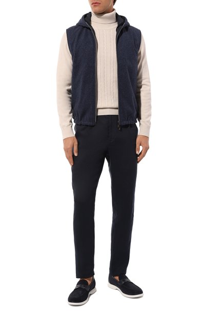 Темно-синий жилет с меланжевым эффектом сшили из мягкой плотной шерсти, хорошо сохраняющей тепло и обеспечивающей защиту от ветра. В качестве утеплителя выбрали почти невесомый тонкий полиэстер, не утяжеляющий вещь. Модель с прорезными карманами, застегивающимися молниями, украсили небольшой нашивкой с фактурным логотипом.