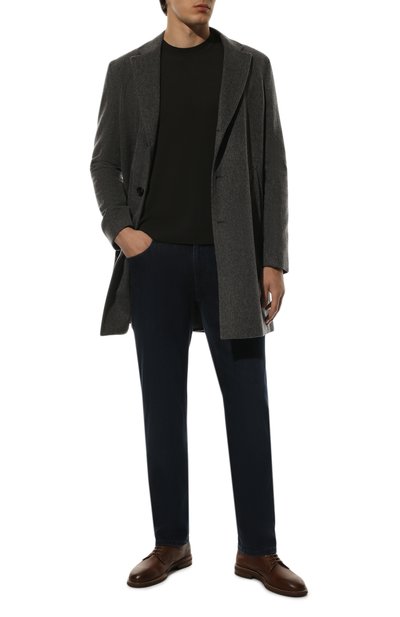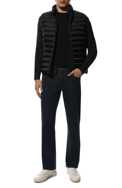 Темно-синие джинсы с фигурной кокеткой сзади могут сыграть роль брюк в нестрогом офисном комплекте. Для пошива модели прямого кроя использовали мягкий и при этом плотный хлопок. В состав добавили гладкий шелк и стрейчевые волокна, чтобы сделать материал прочнее и придать ткани легкий блеск. Пояс сзади украсили брендированным патчем.