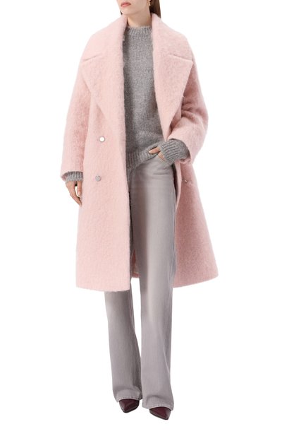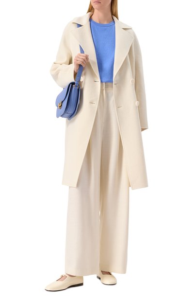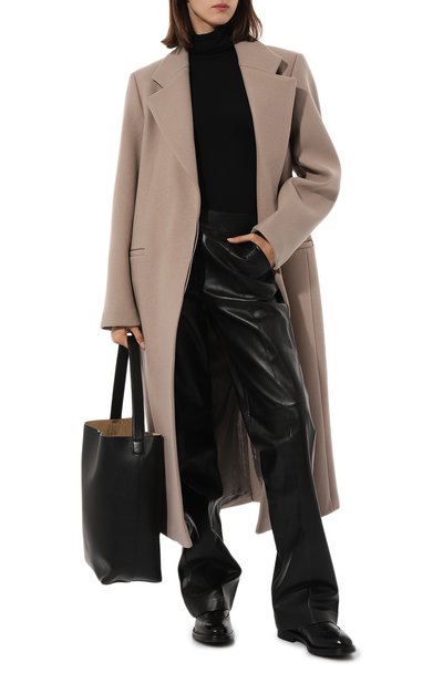 Длинное двубортное пальто без лацканов получилось удобным и экологичным. Чуть приталенное изделие с двумя боковыми карманами выполнили из трикотажной прессованной шерсти, а сырье для этого теплого легкого материала, сертифицированного AZO и REACH, получили у ответственных заводчиков, где животных содержат по принципу «пяти свобод». Бежевая модель с подплечниками, без подклада сидит максимально комфортно.