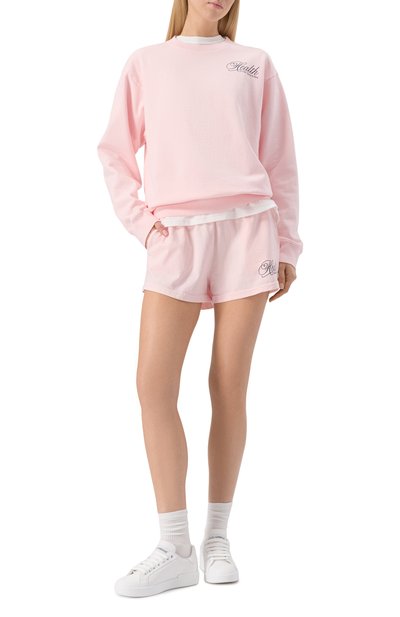 Для пошива голубого короткого свитшота со спущенной линией плеч выбрали плотный португальский трикотаж. Его произвели из органического хлопка, выращенного экологичным методом без использования вредных химикатов. Лаконичную модель украсили спереди миниатюрным логотипом бренда.