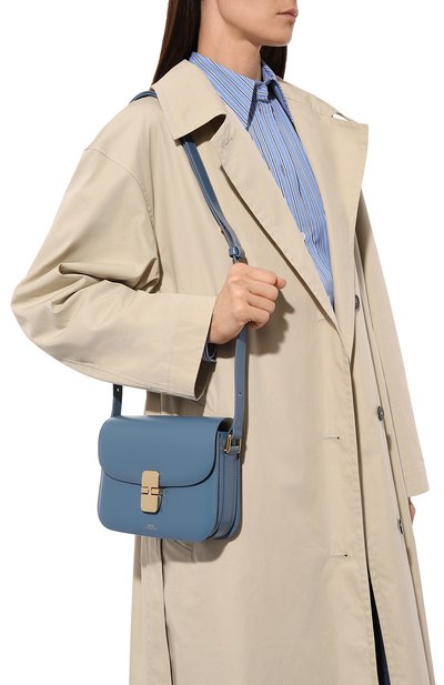 Небольшая голубая сумка Sac Grace с регулируемым плечевым ремнем сшита из гладкой телячьей кожи, отполированной до шелковистого блеска. Деликатный акцент создает крупная золотистая пряжка на широком клапане. Ее оттенок поддерживает миниатюрный логотип на передней панели. В аксессуар с основным отделением и двумя карманами поместятся смартфон, картхолдер и ключи.