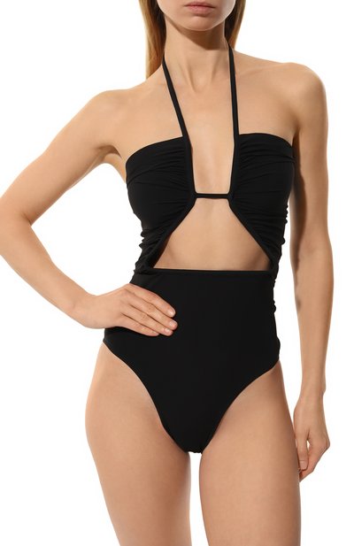 Черный цвет и отсутствие декора делают этот слитный купальник максимально лаконичным. Для пошива изделия с узкими регулируемыми бретелями и круглыми формованными чашечками использовали прочный шелковистый нейлон с добавлением эластана. Материал плотно облегает фигуру.