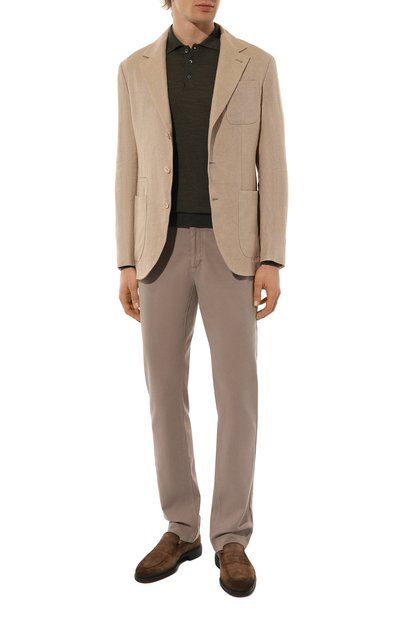 Для пошива поло оттенка хаки использовали тонкий трикотаж из нежного хлопка ценных сортов: его волокна отличаются особой гладкостью и мягкостью, поэтому изделие получилось приятным на ощупь и приобрело деликатный блеск. Характерные для такой одежды пуговицы заменили скрытой под уз кими планками молнией с брендированным пуллером из полированного металла.