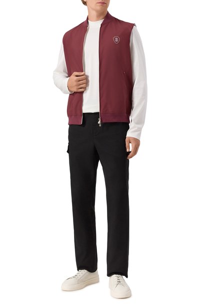 Красно-коричневый жилет не только сделает образ более ярким, но и сохранит комфорт в прохладную погоду. Оптимальный микроклимат поддержит легкая фланель из отборной шерсти, которая стала особенно мягкой, дышащей и не пилингующейся благодаря шелку. Воротник-стойка защитит шею от ветра, а эластичный пояс не пропустит холодный воздух внутрь. Модель со стеганым ромбовым узором украсили металлической эмблемой Royal Eagle.