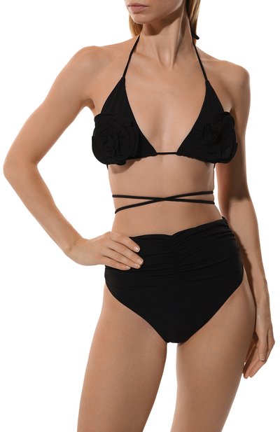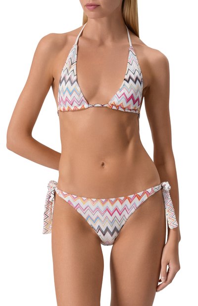 Главную роль в декоре раздельного купальника с мягкими треугольными чашечками отдали черно-белому зебровому принту. Анималистичный рисунок нанесли на эластичный полиамид, который приятн о ощущается на теле, отлично тянется и быстро высыхает. Тем же материалом обтянули скользящую пряжку, которая украшает плавки-бикини слева.