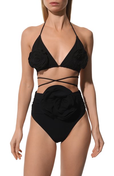Главную роль в декоре раздельного купальника с мягкими треугольными чашечками отдали черно-белому зебровому принту. Анималистичный рисунок нанесли на эластичный полиамид, который приятно ощущается на теле, отлично тянется и быстро высыхает. Тем же материалом обтянули скользящую пряжку, которая украшает плавки-бикини слева.