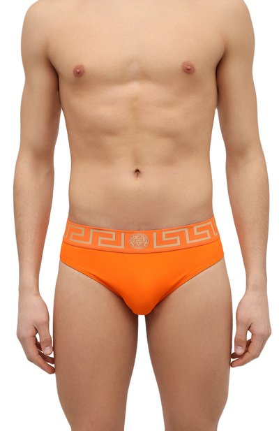 Синие плавки изготовили из эла стичного плотного материала на основе нейлона и стрейчевых волокон. Крой подчеркнули белыми контрастными швами, в тон которым сзади выполнили крупную надпись Top и логотип бренда. Пояс дополнили широкими шлевками.