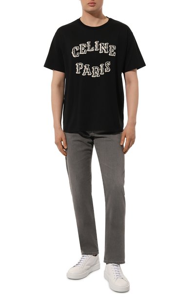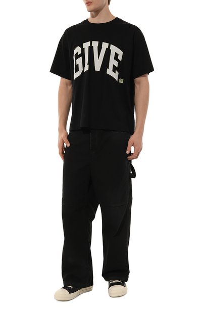 Черная футболка с круглым вырезом сшита из гладкого хлопкового джерси, которое хорошо пропускает воздух. Легкая модель прямого кроя, не сковывающего движения, украшена спереди крупным контрастны м логотипом, а сзади — небольшой эмблемой 4G. Предлагаем создать повседневный образ с серыми шортами и белыми кроссовками.