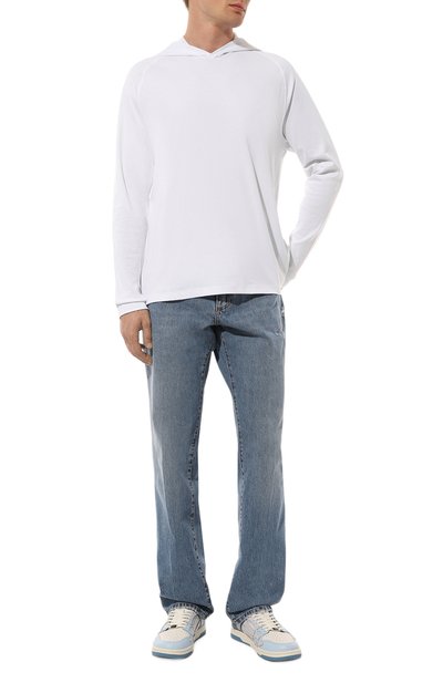Белое худи вошло в капсульную коллекцию, созданную в коллаборации с американской маркой Bstroy. Для изготовления модели использовали мягкий хлопковый футер, который хорошо удерживает тепло и не вытягивается со временем. Спереди модель украсили красными логотипами в прямом и зеркальном отображении, а сзади этот декор повторили в противоположном исполнении.