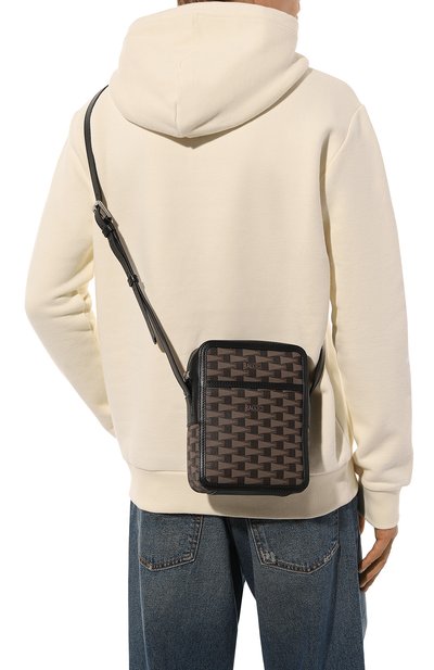 Коричневая сумка заявляет о своем происхождении при помощи крупного повторяющегося логотипа марки, основанной Джанни Версаче. Брендированный жаккардовый узор на плотном текстиле, из которого сшили модель, оттенили отделкой из однотонной телячьей кожи. В аксессуар с внутренним карманом поместят ся смартфон и паспорт. Изделие с короткими ручками дополнили съемным плечевым ремнем.