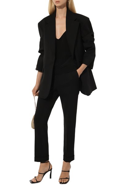 За строгим дизайном однобортного черного жакета скрывается высокий уровень комфорта. Конструкция с полуподкладом делает модель прямого кроя более легкой и обеспечивает свободу движений, а вискозный трикотаж гарантирует мягкость и эластичность. Чтобы нежный материал не вытягивался и не мялся, в него включили прочный полиэстер. Изделие с боковыми карманами дополнили шлицей и разрезами сзади на рукавах.