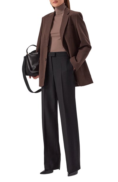 Однобортный жакет прямого кроя сшит из шерстяного трикотажа. Модель с широкими лацканами и полуподкладом дополнена двумя врезными карманами с клапанами.