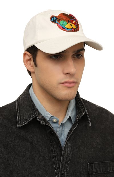 Бейсболку кремового оттенка выполнили из легкого и при этом плотного полиэстера с принтом, напоминающим рисунки от руки. Тулью спереди украсили вышитым мотивом в виде логотипа бренда и знакового желтого смайлика. Комфортную посадку по голове удобн о регулировать пластиковым ремешком сзади.