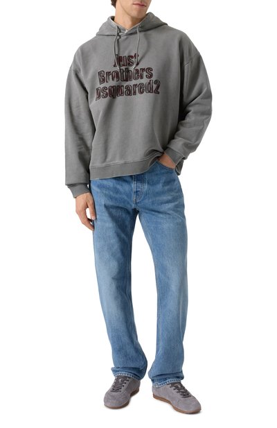 Серые кроссовки Eric с отделкой из гладкой кожи выполнили из бархатистой прочной замши, тонко выделанной для эластичности. Чтобы в обуви было комфортнее в теплую погоду, на союзке и боковых панелях предусмотрели перфорацию. Модель с фирменными печатями и штампами на гибкой легкой подошве декорировали крупными аппликациями в виде узнаваемых иероглифов.