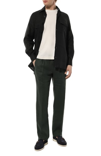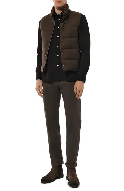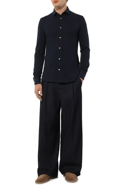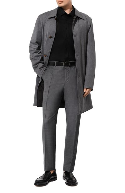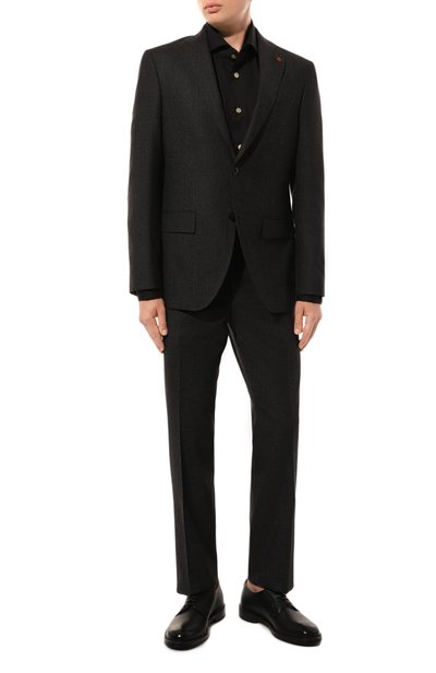 Мастера неаполитанской марки выполнили рубашку из плотного черного хлопка с серым ромбовым микроузором. Для ткани отобрали сырье с длинными волокнами и тщательно очистили его от жестких частиц, чтобы модель получилась очень мягкой. Комфорт создают и ручные швы, которые превосходят машинные в эластичности. Изделие с закругленной линией низа застегивается пуговицами из австралийского перламутра Pinctada Maxima.