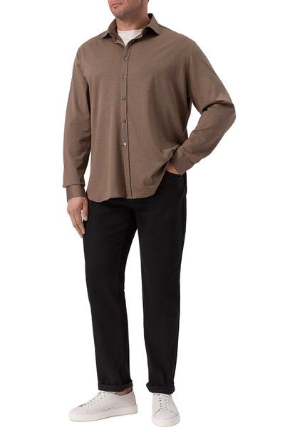 Коричневая свободная рубашка с мягкой линией плеч комфортно садится по фигуре и не ограничивает движения. Для создания модели с двумя крупными втачными карманами использовали тонкий фактурный лен. Лубяные волокна обладают терморегулирующими свойствами, поэтому изделие с капюшоном поддерживает оптимальный микроклимат.