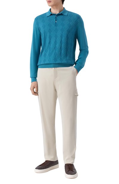 У ярко-желтого поло есть все шансы стать главной деталью образа. Лаконичную модель с длинными рукавами изготовили из тонкого легкого хлопка джерси. Обработка в технике мерсеризации придала материалу деликатный блеск и сделала его особенно мягким, приятным на ощупь и прочным, словно шелк. Для создания изделия неаполитанские мастера выполнили 22 операции, большую часть из которых вручную.