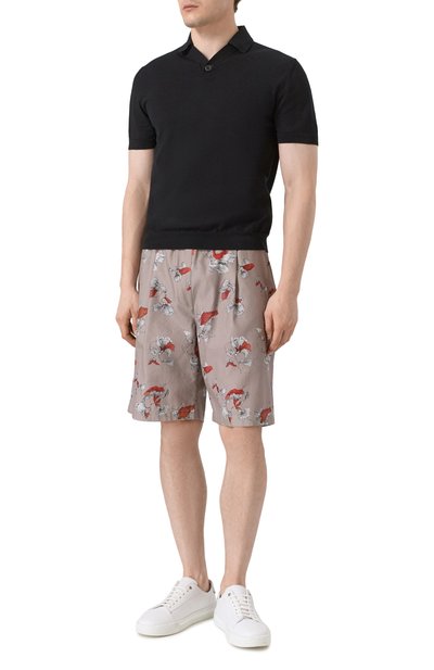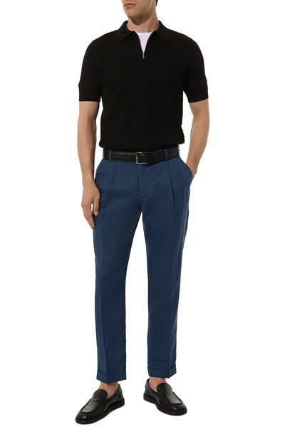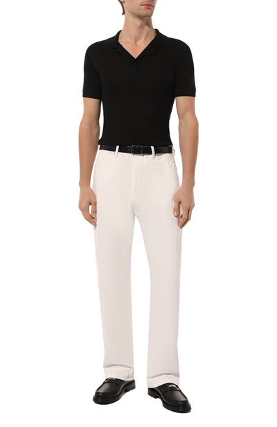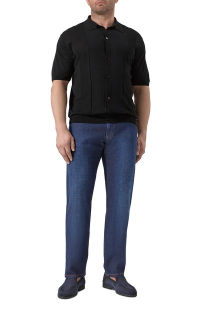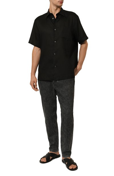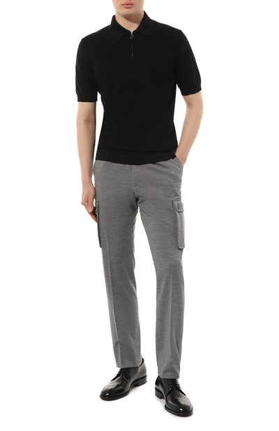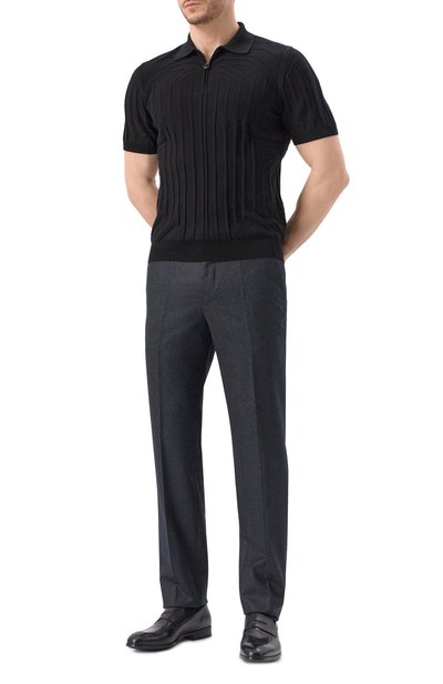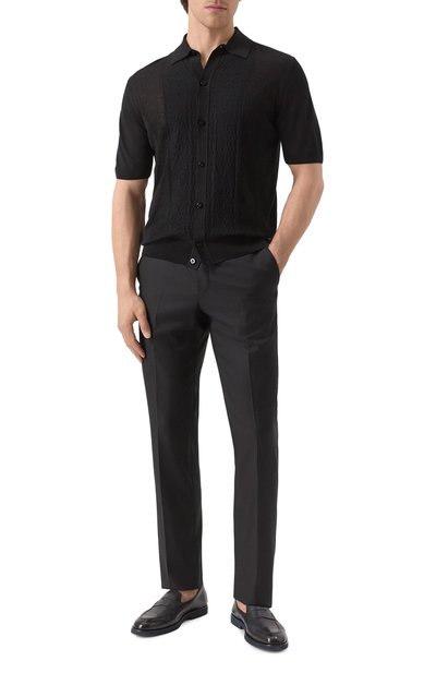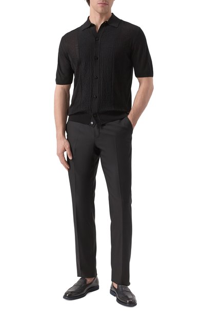 Черную рубашку с короткими рукавами адаптировали для прохладных летних дней. Для пошива изделия использовали мягкий трикотаж на основе тончайшей шерсти премиального качества, которая поддерживает оптимальный микроклимат и не впитывает запахи. Чтобы сделать материал еще приятнее на ощупь, прочнее и придать деликатный блеск, в пряжу добавили гл адкие шелковые волокна.