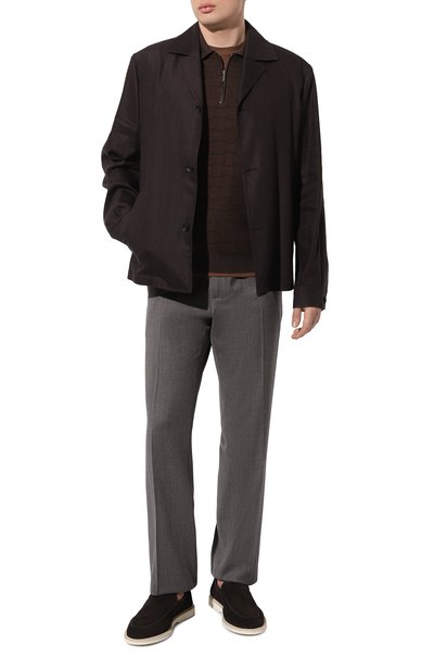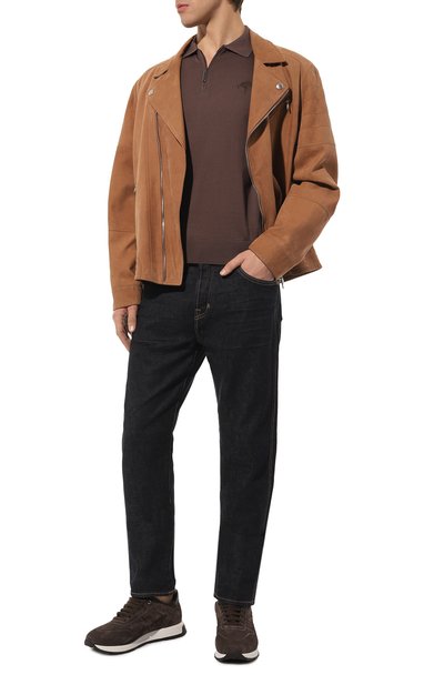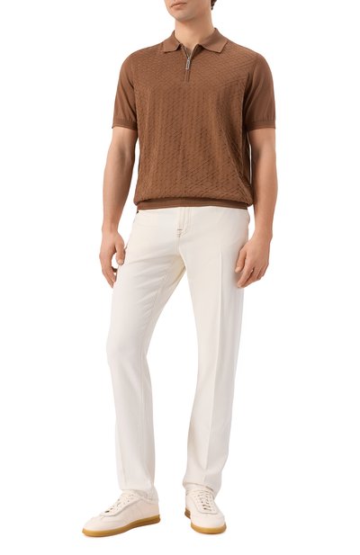 Поло оттенка горького шоколада спереди декорировали графичным жаккардовым мотивом Vanisé Mirage. Максимально комфортной модель сделал трикотаж, в котором соединили нежный и при этом прочный шелк и тонкий дышащий хлопок. Приятный на ощупь материал не подвержен пилингу, поэтому изделие, застегивающееся короткой молнией, долго будет выглядеть как новое.